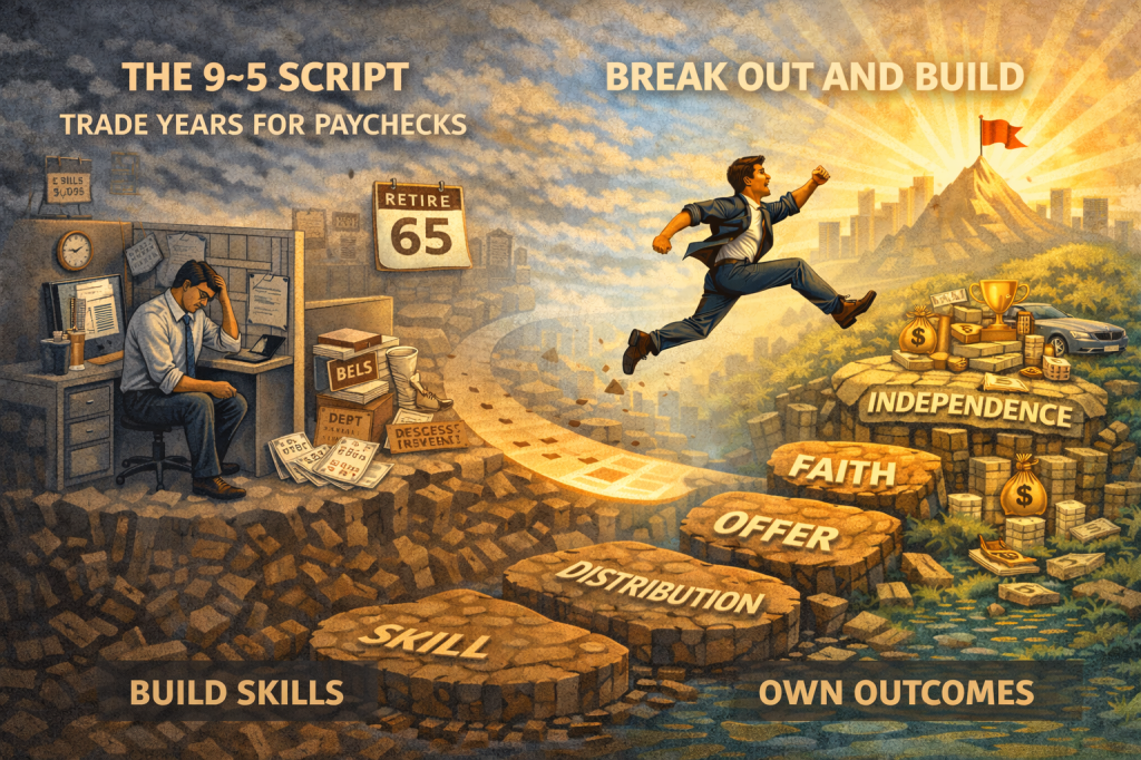 That script is designed to keep you obedient, indebted, and replaceable. You trade your prime years for permission slips—paychecks, performance reviews, PTO requests—while the compounding upside of your work belongs to someone else.